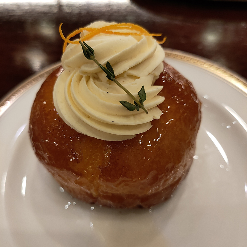 リキュールがたっぷりと染み込んでいるので当然ながらウェッティ。使われているのはコワントローのみと思われる。その分、ちょっと単調な印象で、生地自体もウェッティでなければボソボソとしていそうな食感で、悪いわけではないがこちらも微妙。