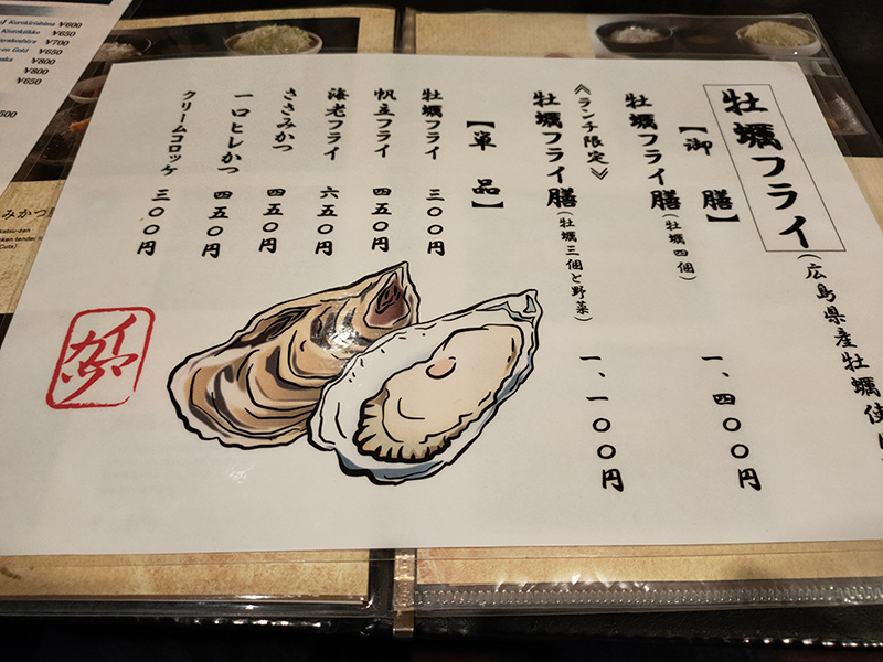 名物のささみかつはお店で頂く予定だったがメニューの牡蠣フライに目が留まり予定変更。