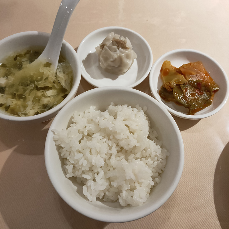 まず最初に運ばれてきたのはスープ、シューマイ、ザーサイ、ライス。スープは出汁の旨味がしっかりと感じられれる。シューマイは1個だが予想外で嬉しい。