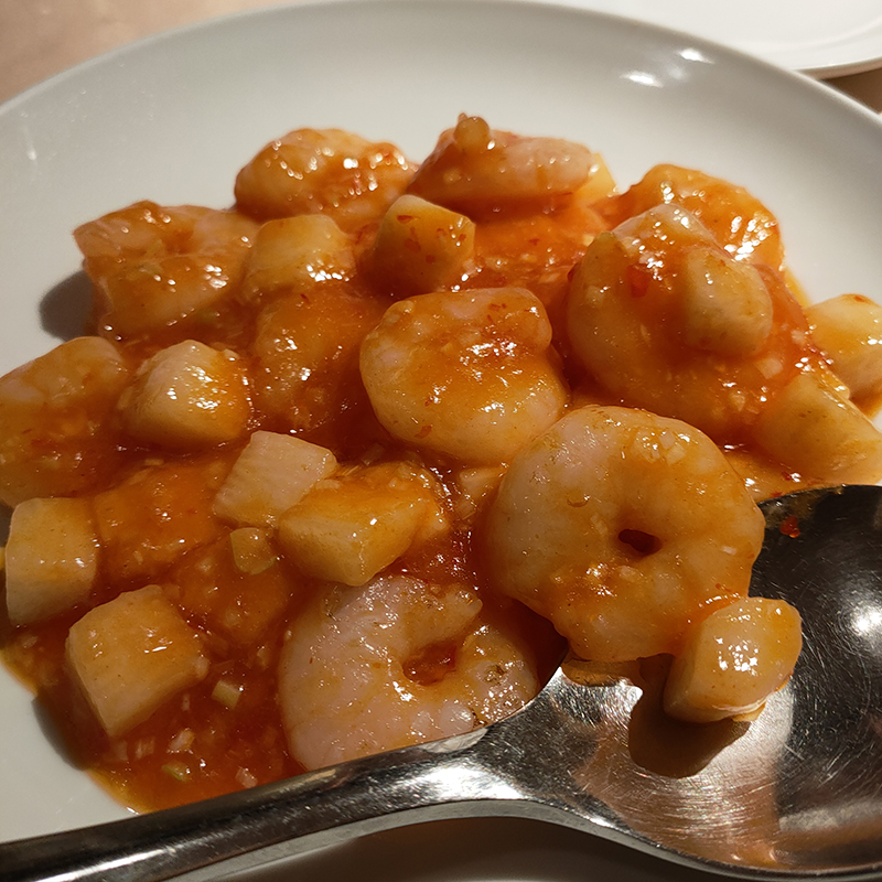 四川色が強いタイプではなく、オーソドックスな味わいのエビチリ。勘所を抑えた調理でクワイのシャキシャキした歯ごたえが単調にならずにアクセントを添えてくれる。