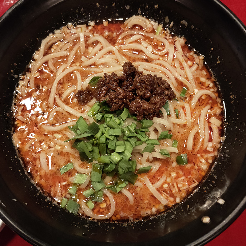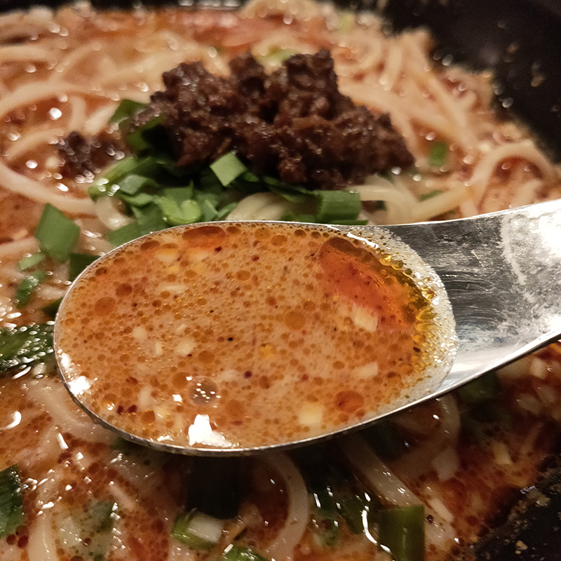スープはごまの香り高く、甘みもあるが、それに負けないくらいしっかりと辛さもある。このコントラストがいい。中太麺は断面が四角くもっちりとした食感でスープとの相性もGood。