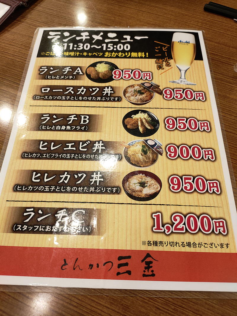 SPFを使用したロースかつは1,700円ほどするが、ランチ定食には950円の品が並ぶ。