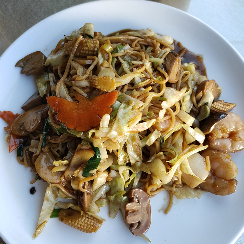 五目やきそばはキャベツ、人参、ニラ、マッシュルーム、ヤングコーン、木耳など野菜類も具だくさん。上品なを保ちながらオイスターソースなど醤油ベースの味付けでバランスがいい。