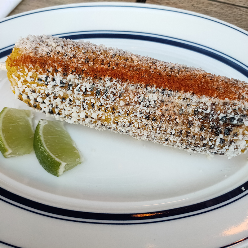コーティーハチーズでコーティングされた焼きとうもろこし。コーンは甘味があって、チリペッパーが香りとアクセントを添える。味変にライムを掛けると爽やかになり、これはこれで面白い。