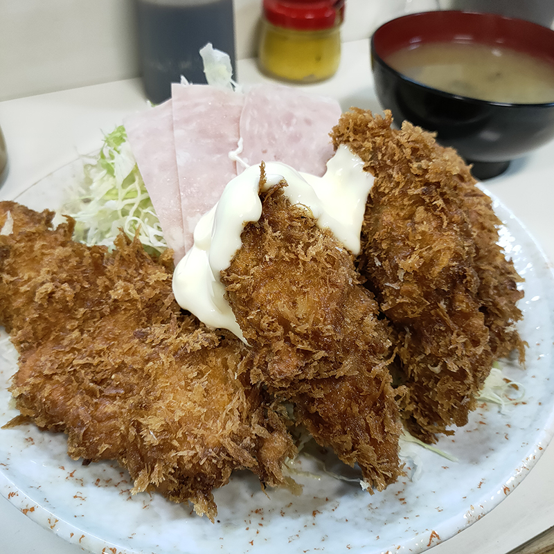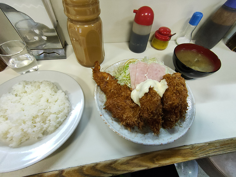 衣は粗パン粉を纏い、油の温度は高いせいか少し焦げた色合い。それでも油切れはよく、サクサクとした食感。カキフライはいい塩梅の火加減でジューシーで旨い。一方、海老フライは開いているためかさはあるがその分、噛んだ時の食感は損なわれる。