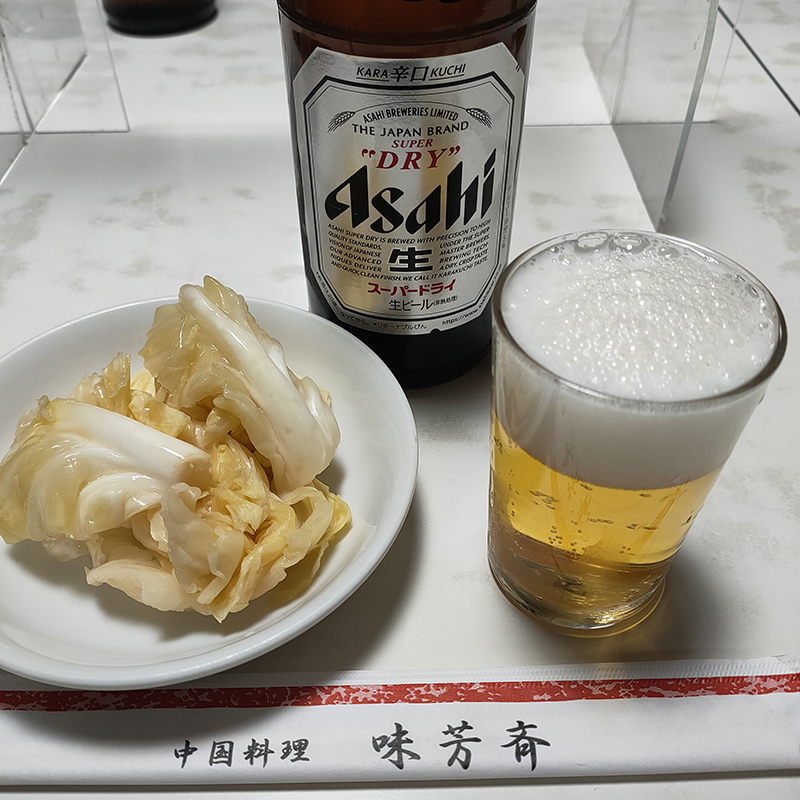 まずはビールで喉を潤す。合いの手に漬物が供されたのだが、これがかなり乳酸たっぷりの発酵臭が強い結構な曲者。これは流石にちょっと苦手。