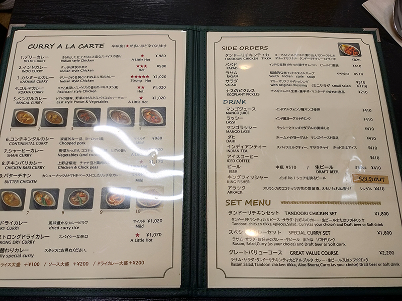 メニューを見るとドリンクにビールをチョイス出来るセットメニューに心惹かれる。以前、タンドリーチキンセットを頂いたので、今回はスペシャルカレーセットに。