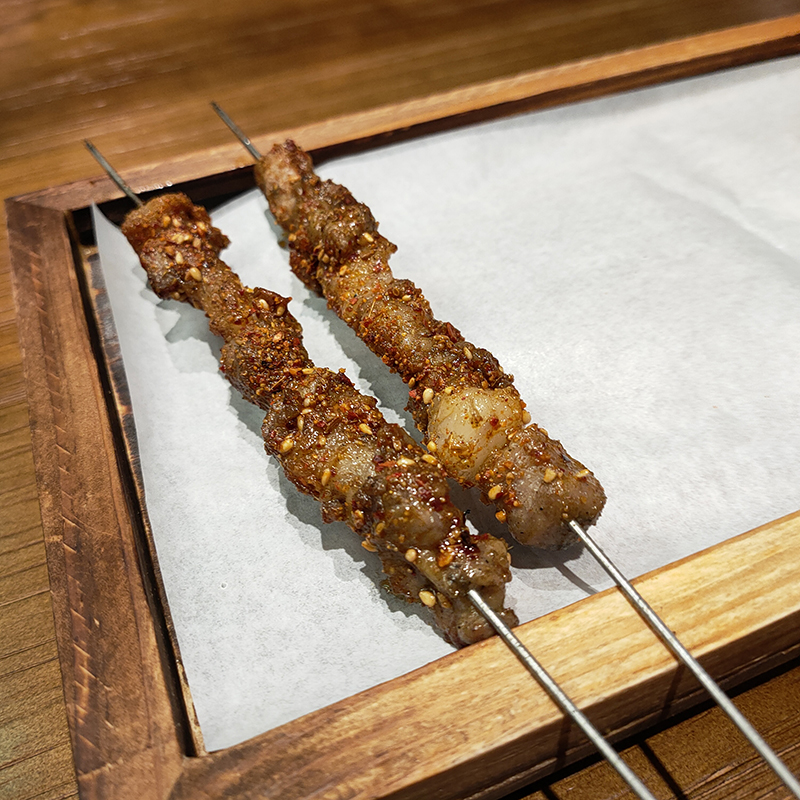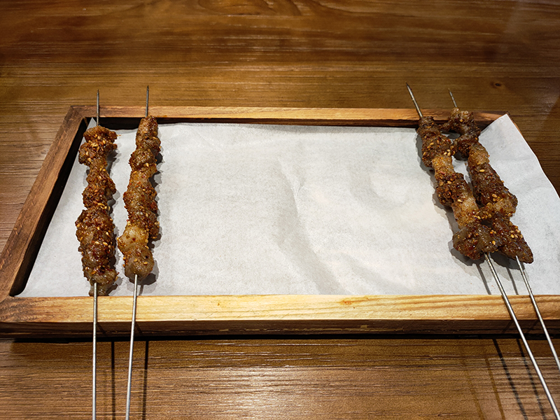 両者の比較では羊の方がオススメ。どちらも七味やスパイスを利かせた味付けで、羊肉の方が圧倒的に柔らかい。他店と比べるとクミンの使い方が少しおとなしめ。