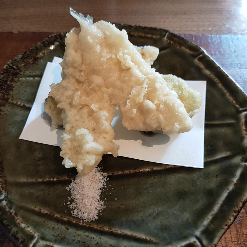 頃合いを見計らって揚げたてを供してくれるところが嬉しい。そのため、少し衣は厚いのだが、サクサクとした食感で衣の厚さがあまり気にならずに頂けた。