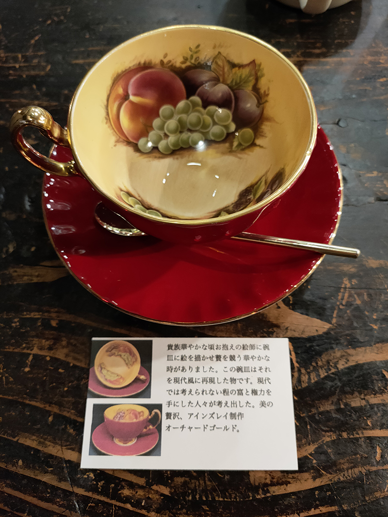 この日出されたカップにはカードが添えられていて、カップの由来が記されている。ポットからは二杯は取れるのでこれで1,160円をどう見るかだが、普通は二杯も頂かないのでやっぱりコスパは悪い。