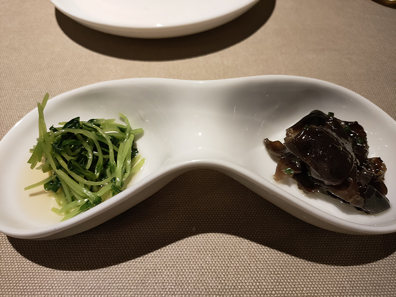 モダンな造りの店内に、呼応するような上品な盛り付け。左から豆苗のお浸しと木耳の山椒炒め。お浸しと言ってもそこは中華。品のいい上湯を使用している。木耳は山椒と言っても全く刺激はなく優しい味付け。