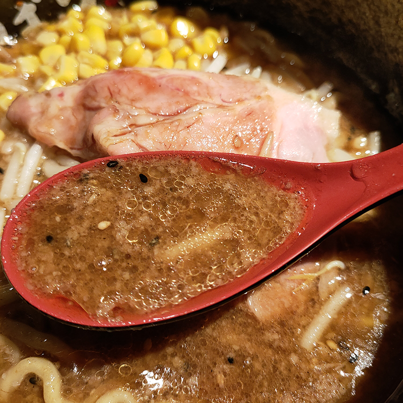 スープは背脂が入ったこってり系の味噌ラーメンだが、それほど油っぽさを感じせない円やかなテイスト。口当たりもどこか優しい。ダシは豚、鶏、魚介に香味野菜で取られたもので、味噌は5種類をブレンドして使用している。このくらいのこってりさならご飯ともよく合う。