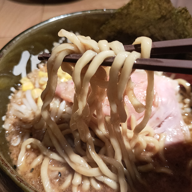 麺は浅草開化楼の中太ちぢれ麺。もっちりとした食感で旨味十分。スープとの絡み具合、相性ともに申し分ない。薄く来られた低温調理されたチャーシューはしっとりとして良くできているが、1枚だけというのはちと寂しい。これなら別途、トッピングするものありかと思う。