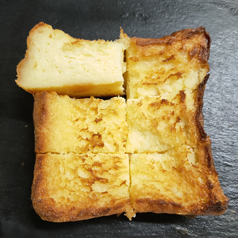 収まりのいい小箱に入ったフレンチトーストにメイプルシロップが付いてくる。こちらをトーストしてバターの溶け出す音がフツフツとした熱々の状態で頂いた。