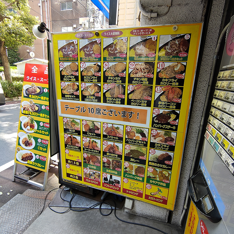 店頭に置かれたメニューを見ると学生街らしくほとんどが1,000円以下。バリエーションが豊富だが、牛カロリー焼きが看板のようで、メニューの上2段は牛カロリー焼きと他の料理とのセットメニューになる。折角なので、そのセットメニューからチョイス。