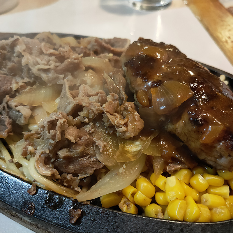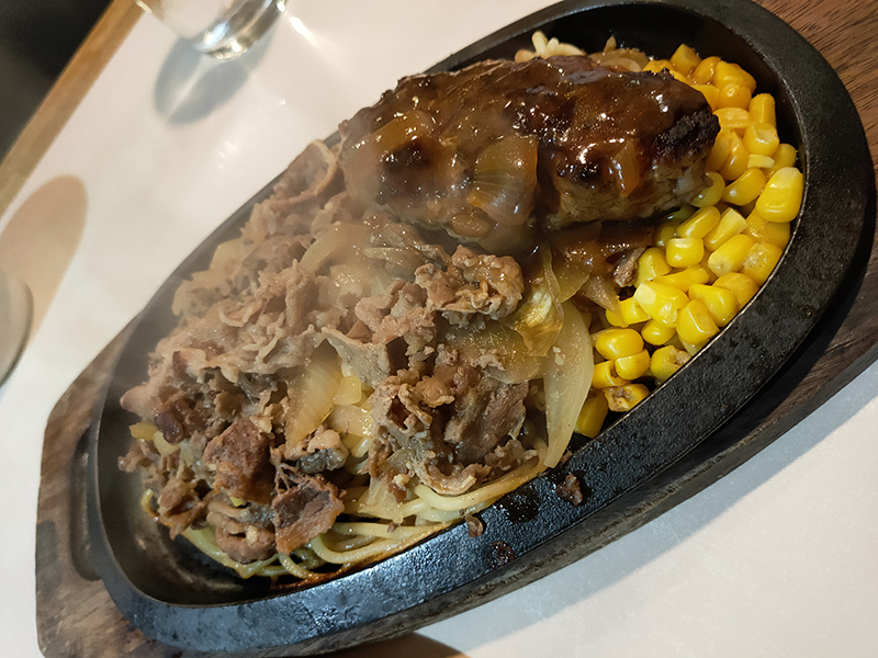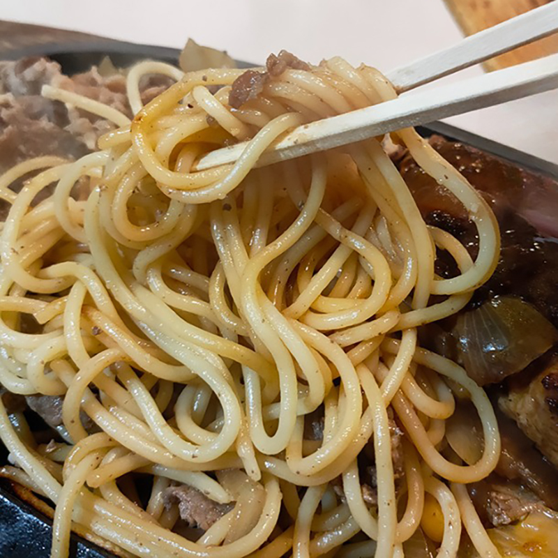 かさの割には意外と肉の量が少ない。その秘密はスパゲティ。肉の下にたっぷりのスパゲティが。単に付け合せの量ではない。ここもガーリック醤油を掛けると熱々の鉄板でいぶされていい塩梅になる。