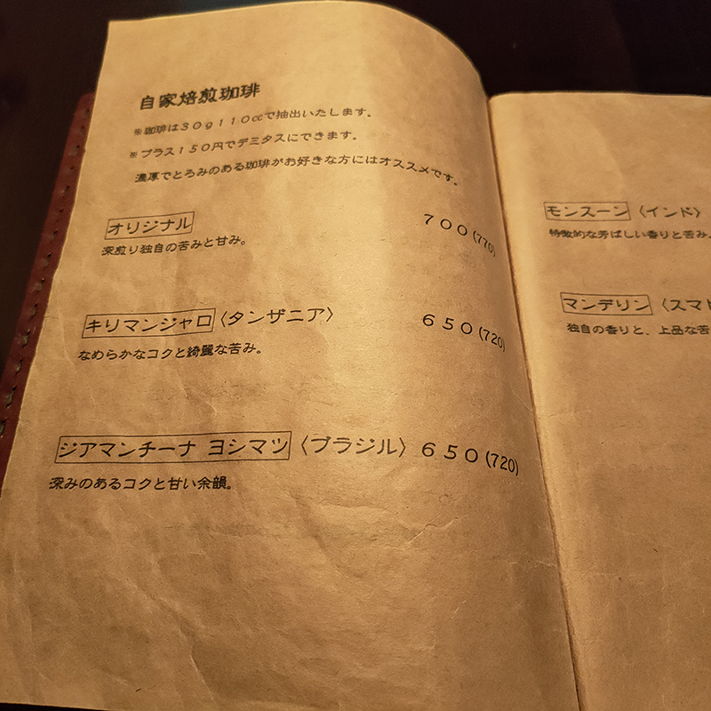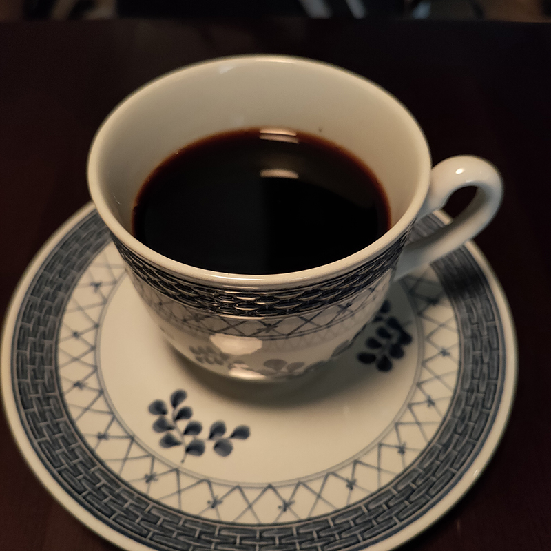 こちらが唯一のブレンドコーヒー。深煎の豆を30g使用しているとの事だが、そこまで濃すぎる感じでもない。適度な温度感のビターテイスト。