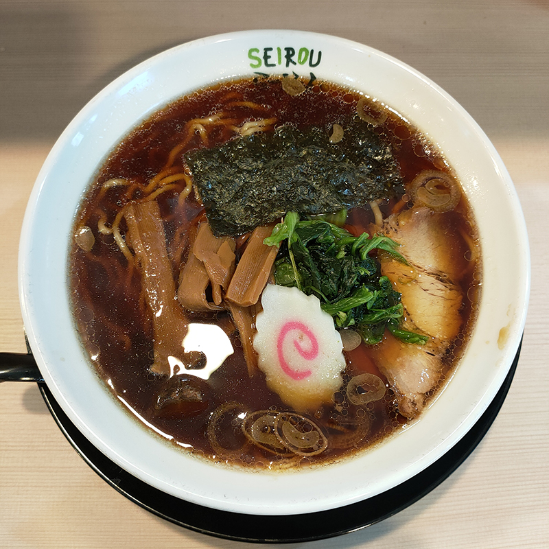結局、トッピングは加えずシンプルにらーめんを。およそ5分で着丼。醤油の色がかなり濃い見た目が印象的。ただ薄いよりは明らかにタイプ。具材はチャーシュー、メンマ、のり、なると、ほうれんそう、ねぎ。