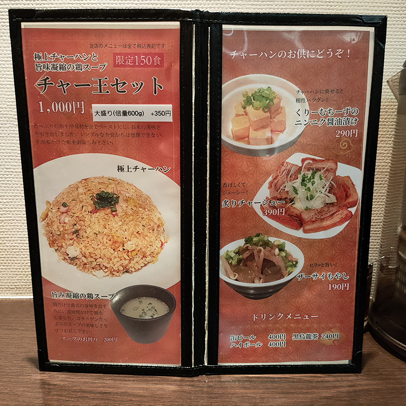 料理はチャー王セットが基本となる。大盛りがある他、副菜としてつまみ類が若干用意されている程度。