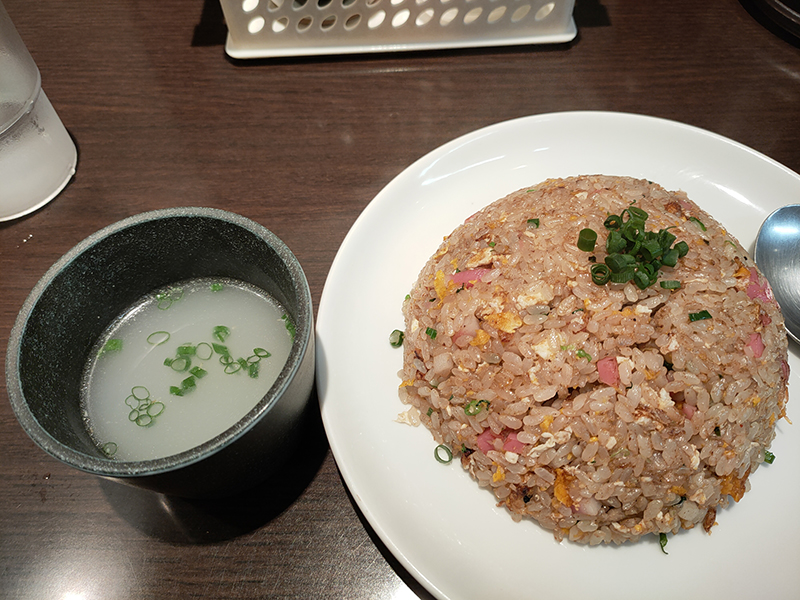 お米はかための炊き加減ということもあってパラパラというよりはお米のでんぷん質がまとわりつかずべっとり感がないイメージ。具材もよく混ざり合っていて調味料の塩味も全体にいきわたっていて普通に美味しい。スープも出汁の旨味が感じられる。