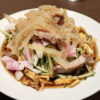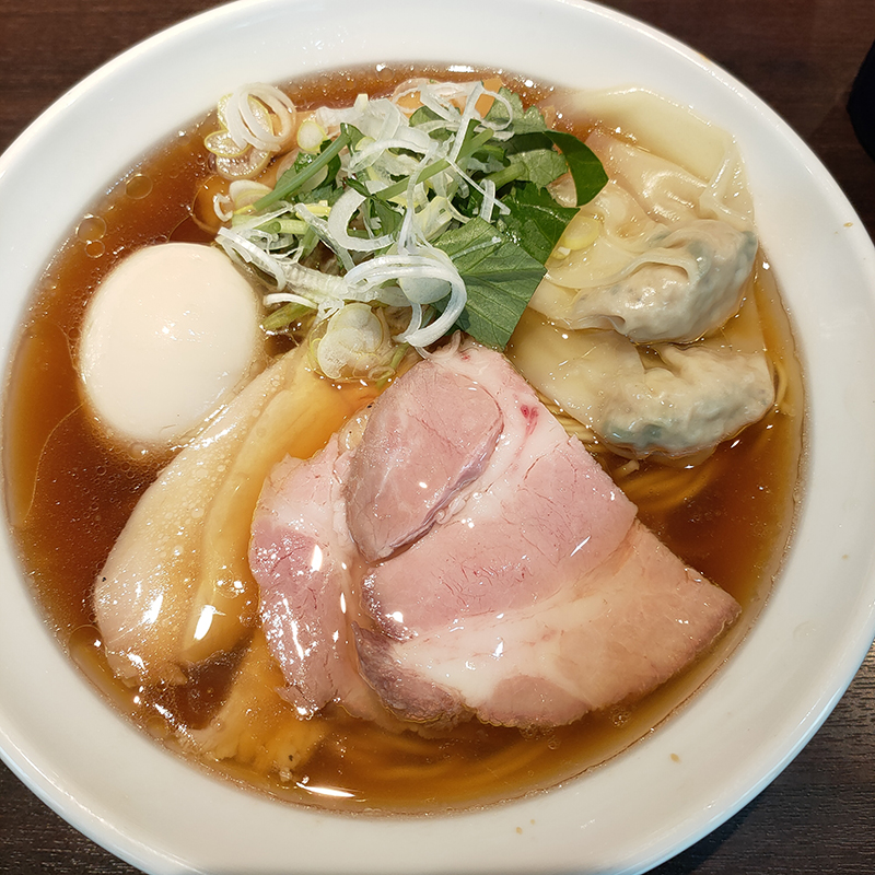 具材はチャーシューが2枚、鶏チャーシューが2枚、ワンタンが2つに煮玉子、野菜という具沢山な構成。
