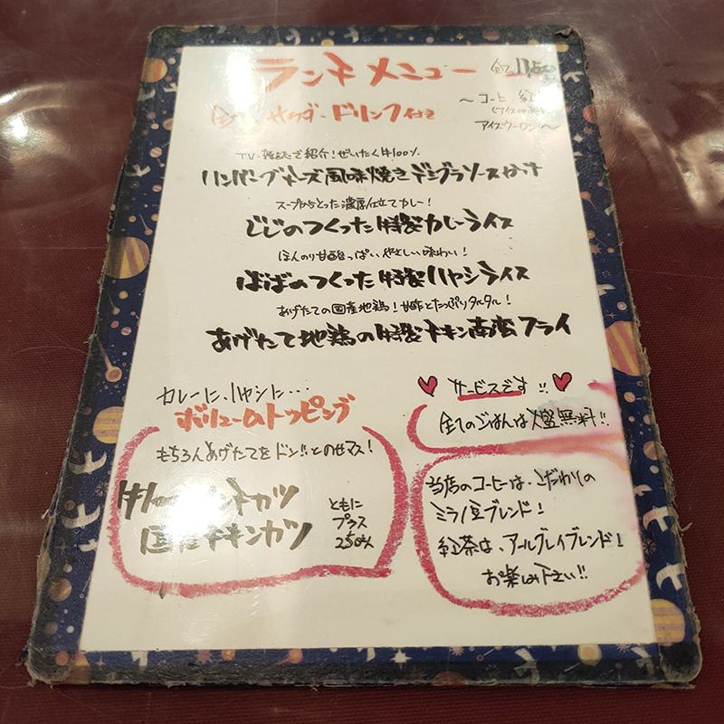 ランチメニューの片面はハンバーグ、カレー、ハヤシ、チキン南蛮等がラインナップ。