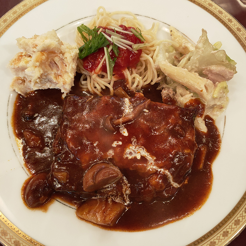四角いフォルムのハンバーグがでーんと鎮座していて迫力満点。それに負けじとポテサラ、トマトパスタ、ペンネの3種の炭水化物が所狭しと並ぶ。