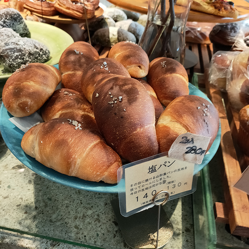 いぶし銀の光に誘われて購入。見た目通りのストイックな味わいの塩パンでバター度は低い。その日の山食パンの生地で作るので日によって生地が変わるところも面白い。