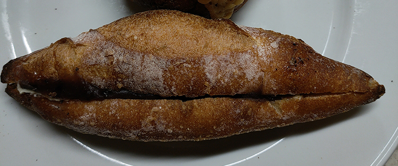 看板にもある様にアンパンが名物。今回はアンパンではなくバケットに餡とバターを挟んだあんバターに。餡は甘すぎず優しい味わいでバターの塩気とコクがまろやかで柔らかい舌触りにしてくれる。