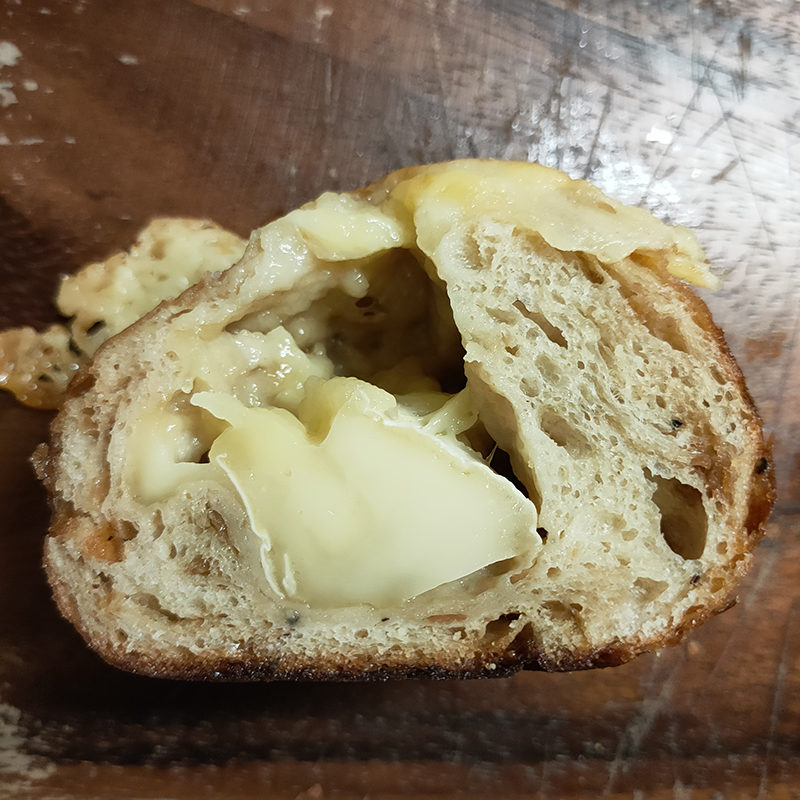 加水多めのしっとりねっとりとした生地が印象的。中にはカマンベールチーズが入っている。