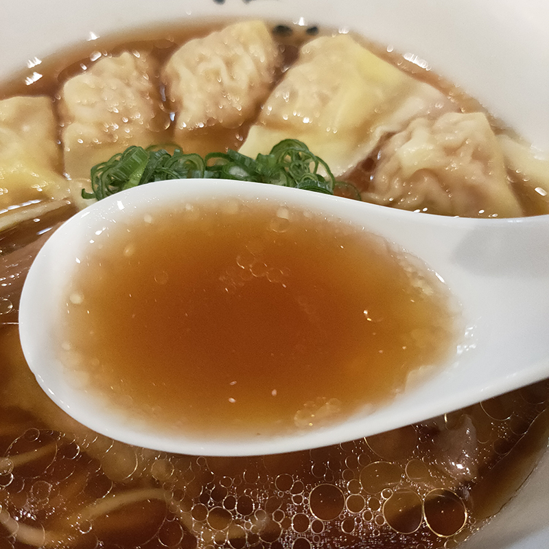 しょうゆの色はしっかりめだが、透明度の高さがレンゲ越しにも見てとれる。しょうゆのしっかりとした香りに下支えされているが、ギスギスしたところがない。出汁の旨味も感じられほどよく丸みを帯びている。