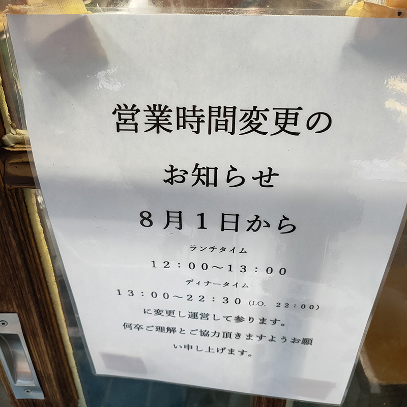 待っている間、貼り紙を見ると8月1日から営業時間が変更となり、12時から13時がランチタイム、13時以降がディナータイムとなっていて、どうやら通し営業になった模様。