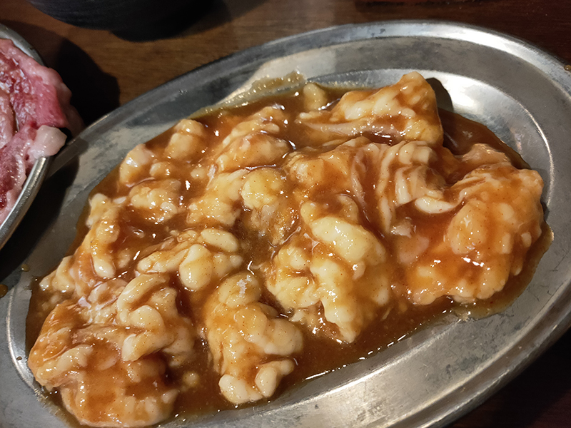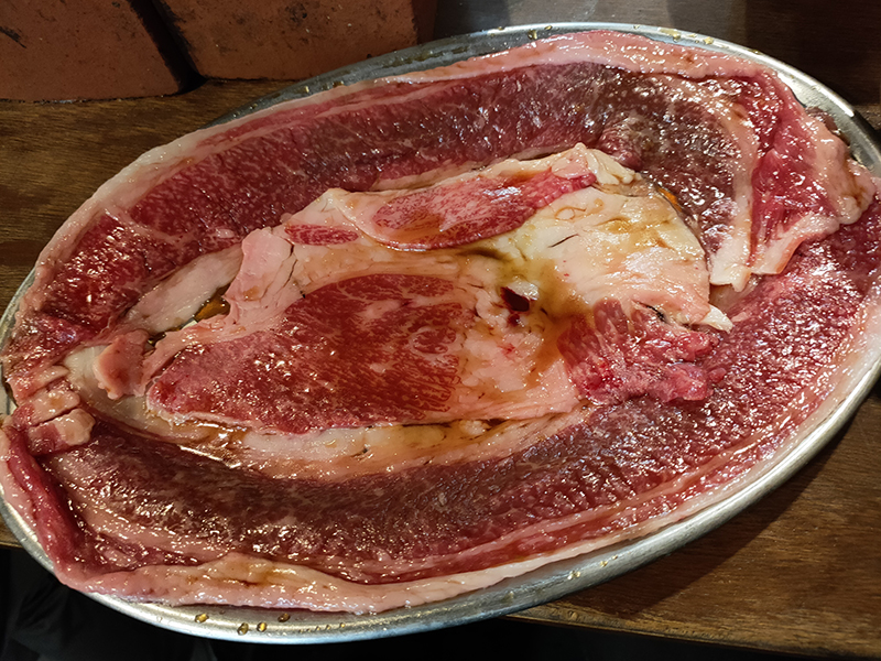 細長いプレートに豪快に乗せられたカルビ。肉質もさることながら七輪で焼くので炭で燻され、余分な脂も落ちる。相変わらずのコスパの高さ。