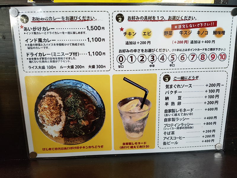 メニューはあいがけカレーが断然の一番人気。ベースとなるカレーはチキンかエビの2択。このいずれかとキーマカレーとのコンビネーションになる。