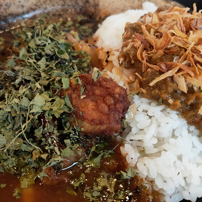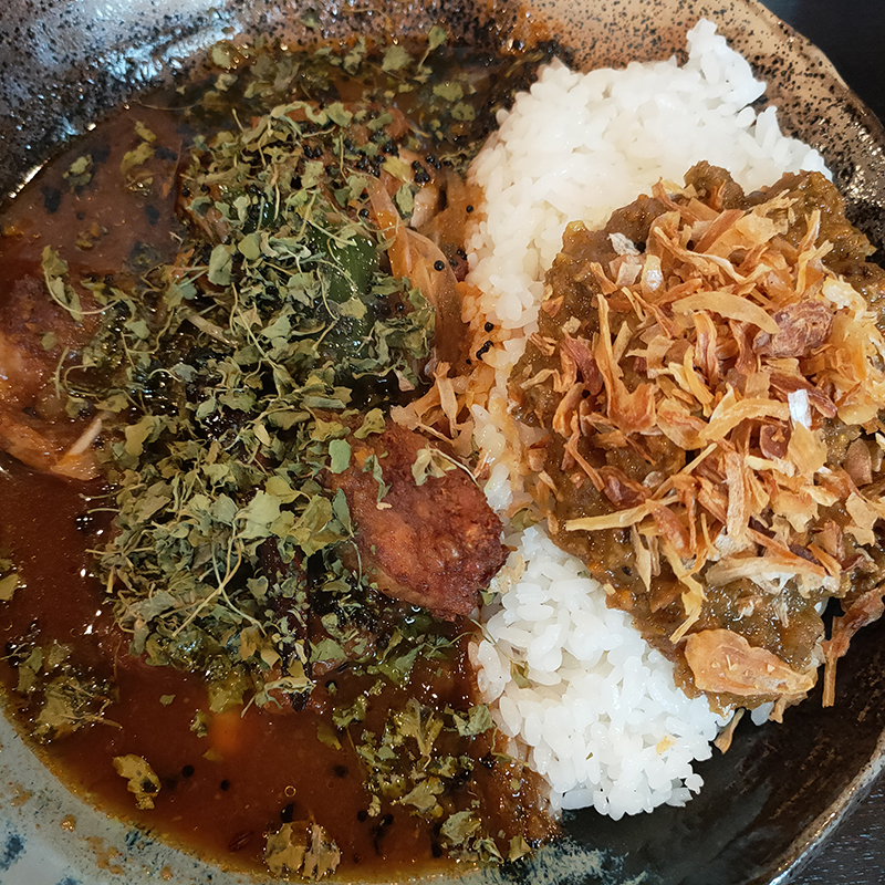 チキンカレーそのものはサラサラ系ながらしっかりとコクもあってウェルバランス。ただ見た目と想像よりもスパイシーさは穏やかな印象。キーマカレーは優しい味わいで両者のメリハリはあるが、これならばチキン一択でも良さそうだ。辛さは5でも中辛くらいのイメージだったので次回は7以上を試してみたい。
