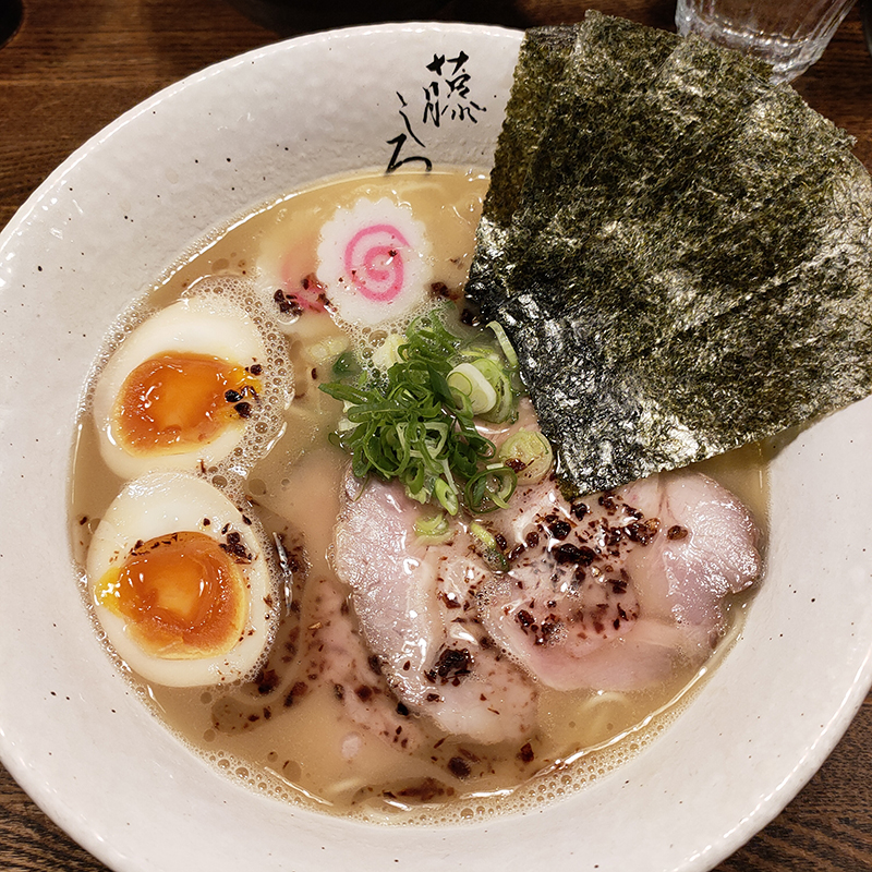 具材はチャーシュー、メンマ、煮玉子、なると、のり、九条ネギという構成。表面には焦がしネギの姿も。