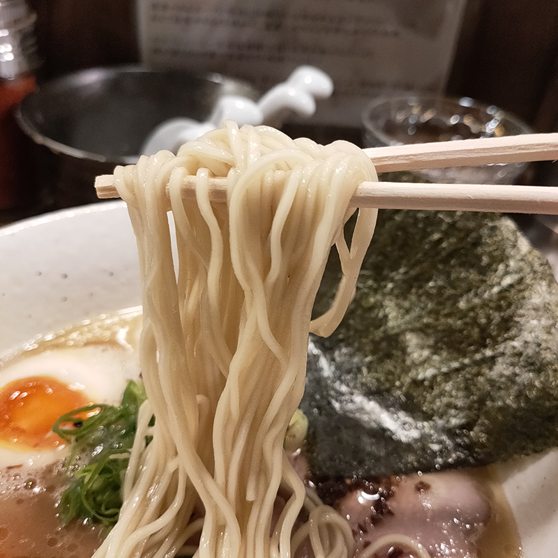 細いストレート麺は小気味いい食感でスープとのバランスは良好。旨味も感じられる。やや量が少ないため、大盛くらいが丁度良さそうだ。周りを見ると替玉を注文する人が多いのも頷ける。