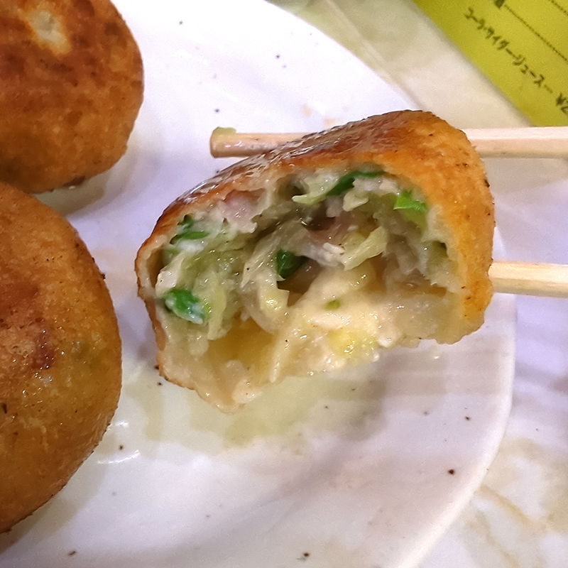 なるほど、これは名物と銘打っているだけあって個性的な容姿。皮目にはしっかりと焼色がついていて、そして丸い。食べた印象は揚げ餃子に近い。表面がクリスピーでカリカリと香ばしい。一見皮が厚そうに見えるがカリカリ部分は極薄。