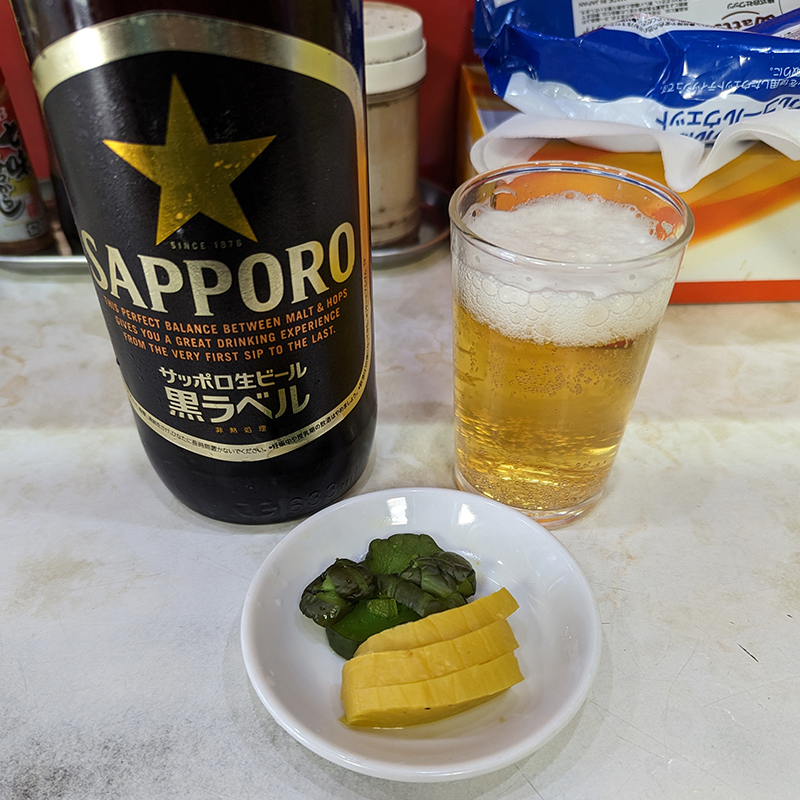まずはビールを注文。このエリアでは珍しいサッポロ黒ラベル。よく冷えていて空きっ腹に染み渡る。