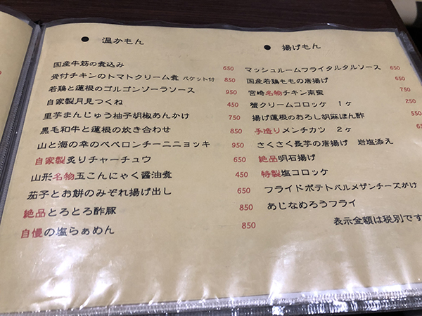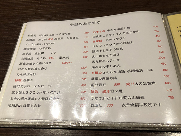 日暮里にある焼鳥屋さんの二号店であるらしい。それだけに、焼鳥などの鳥料理は勿論の事、刺身から中華、洋食に至るまで実にバラエティに富んでいている。厨房には二人しかいないのにこの品揃えは驚異的と言ってよい。