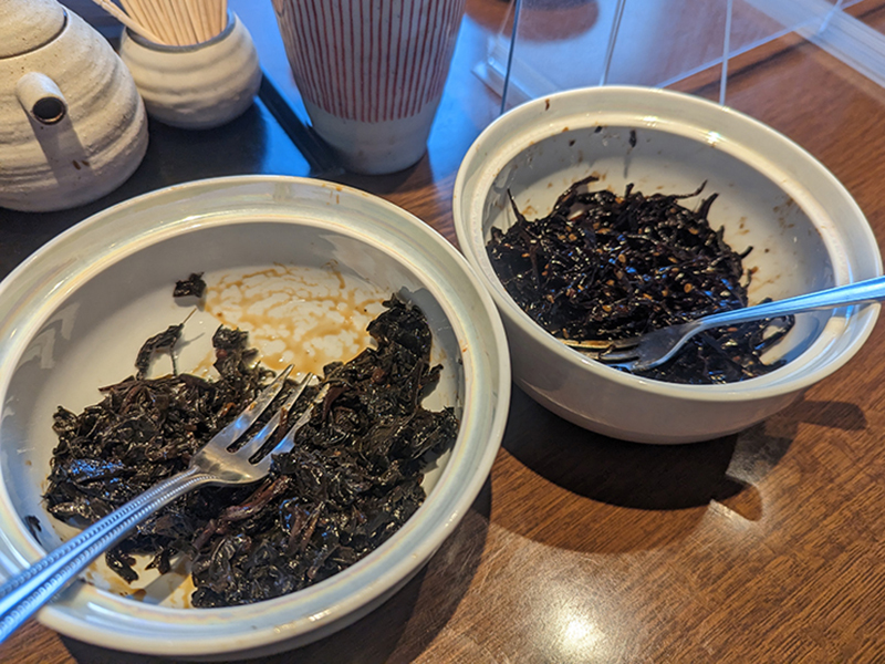 卓上には葉唐辛子と昆布の佃煮が置かれていてこれだけでごはんが進む。尚、ごはんはおかわり自由。