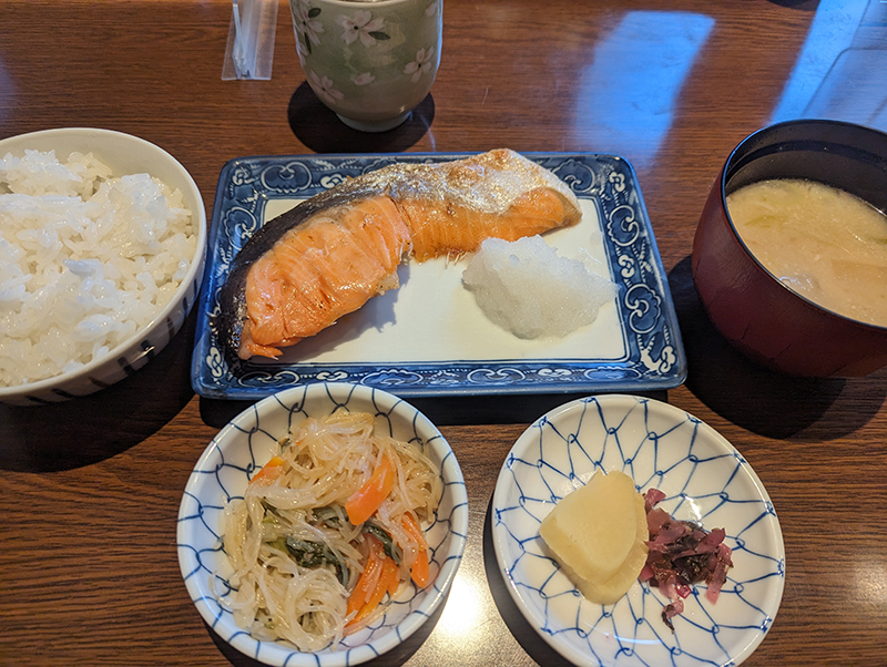 10分ほどで料理が供された。サケの他に小鉢が付いてくる。