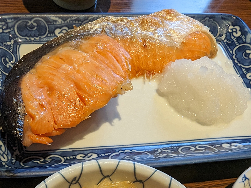 鮭はもう少し塩が効いていればいいと思うくらい少し甘めながら身が大きくふっくらとした焼き上がり。