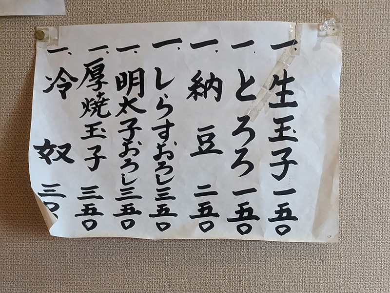 壁には納豆などちょっとしたサイドメニューも用意されている。
