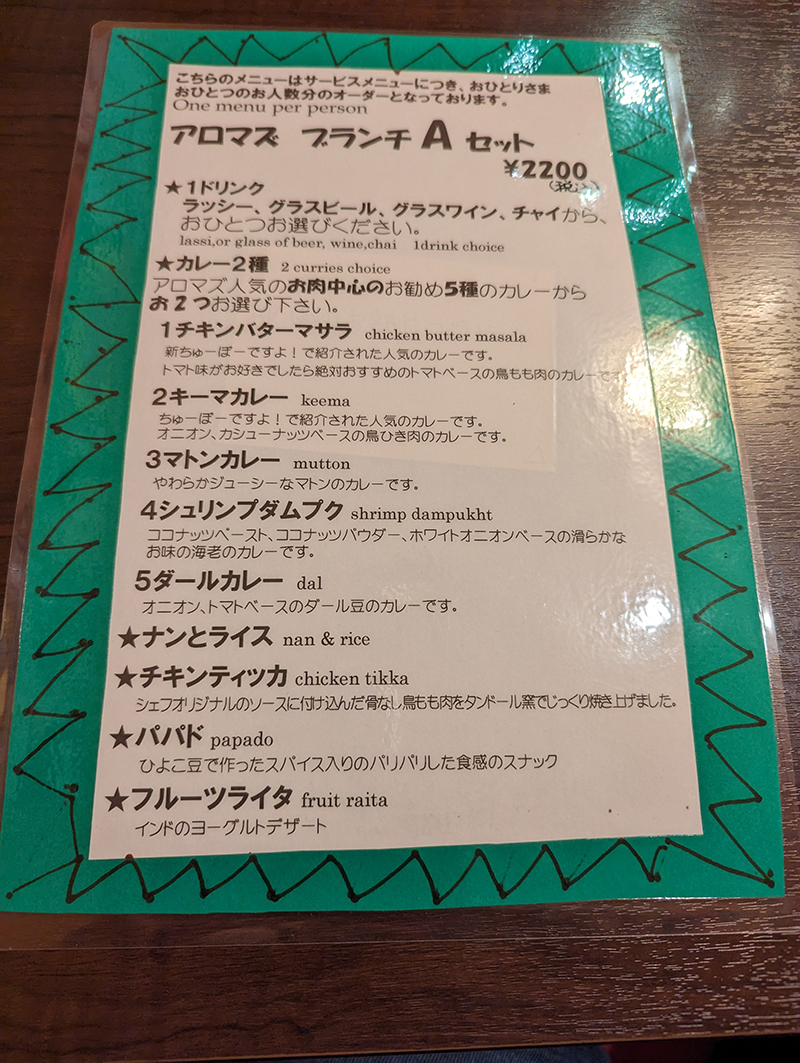 野菜中心のカレーを選択するセットと肉中心のカレーを選択するセットの2種類だが共に2,000円越え。
