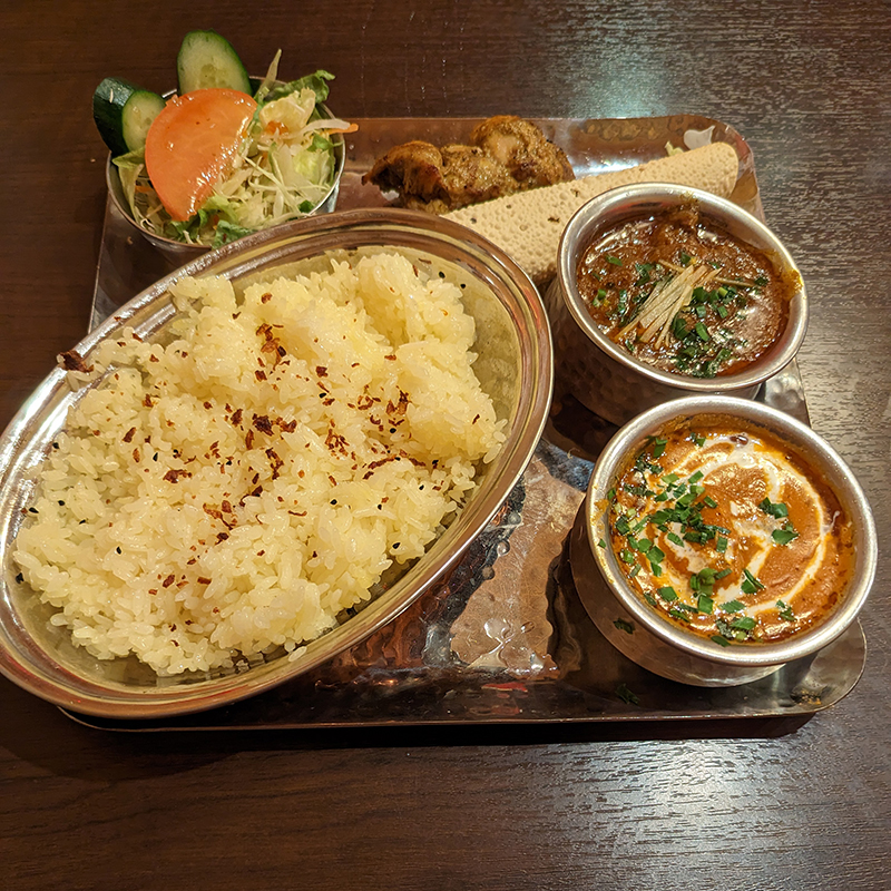 カレーは5種類の中から、2種類選択できる。今回はこのお店でも人気の高いチキンバターマサラとマトンカレーをチョイス。敢えてナンは選択せずにサフランライスのみにしてもらった。