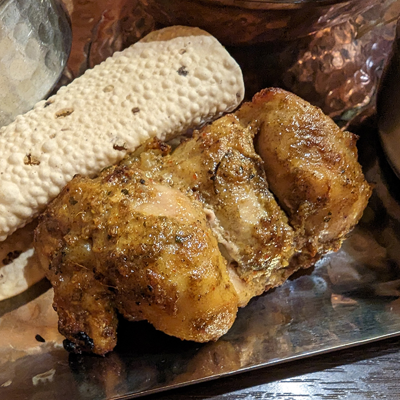 チキンティッカもスパイスの塩梅がほどよく浸透して完成度が高い。パパドも香ばしく食感も軽快だ。