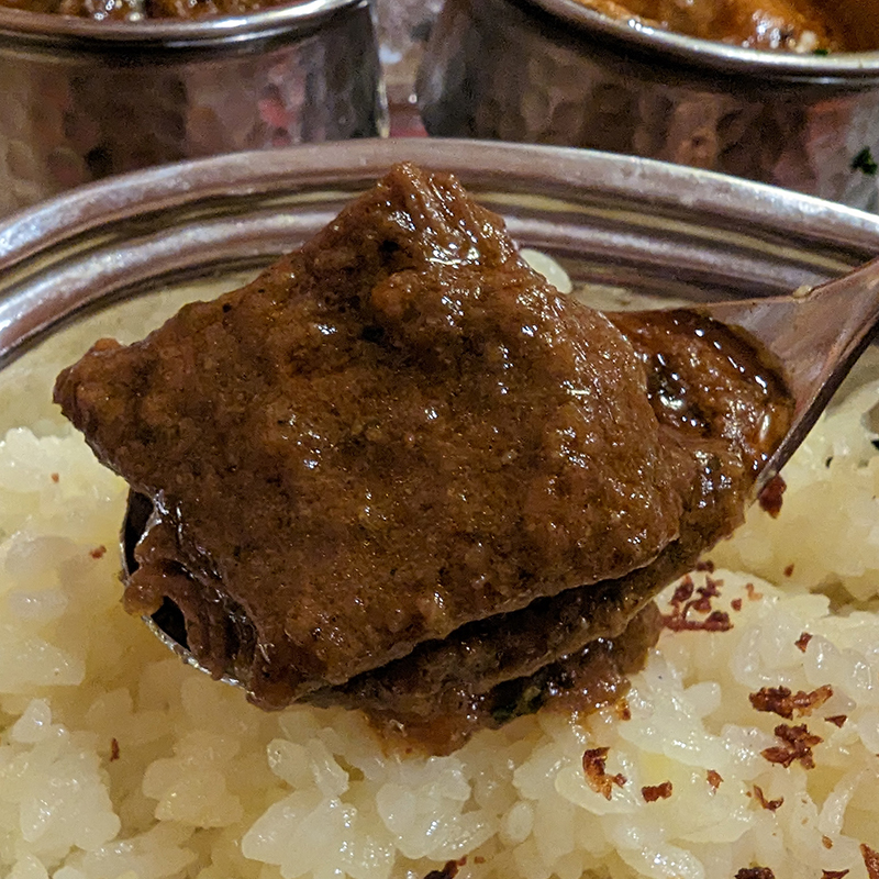 マトンカレーは大きな肉片が入っていて、とても柔らかく味もよく染みていて旨い。少し塩味が強いところが気にはなったがカレー自体にしっかりとコクがある。