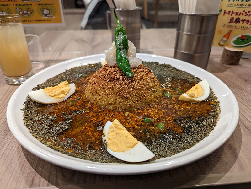 広いお皿全体にルーが覆い、その中央にサフランライスが配されている。更にその頂きには素揚げしたししとうが乗る。