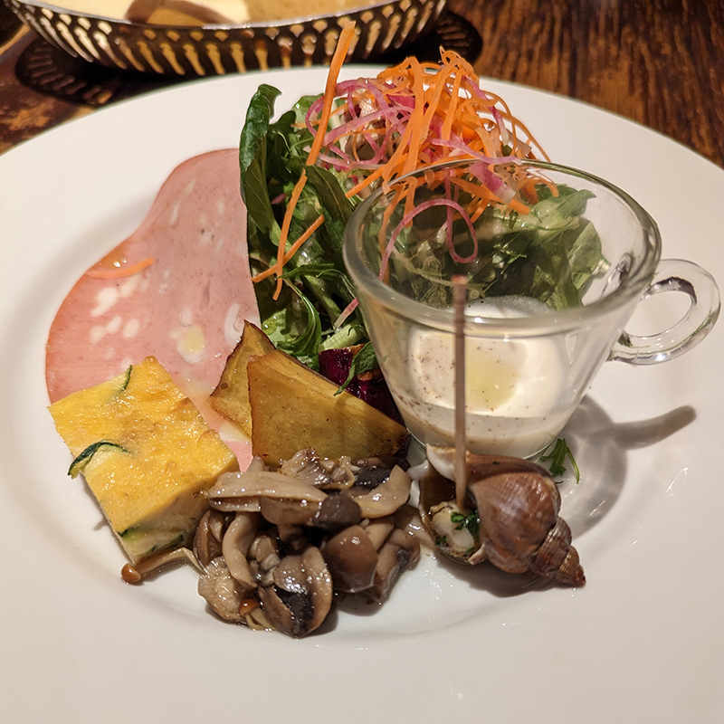 まずそのボリュームにびっくり。サラダやハムに留まらず、キノコのマリネやつぶ貝など手の加わった料理も盛りだくさん。本当にこの値段でやっていけるのかこちらが心配になる。